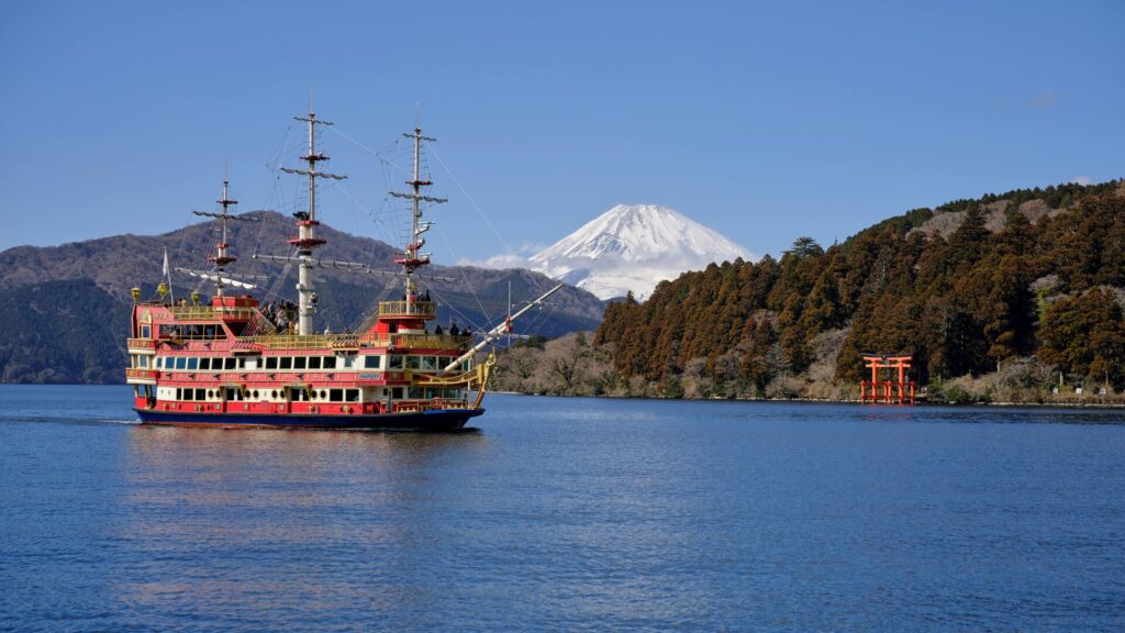 Lake Ashi is a crater lake formed roughly 3,000 years ago by a volcanic eruption. The Hakone Sightseeing Cruise operates replica pirate ships across the lake, connecting Togendai, Hakone-machi, and Moto-Hakone. On clear days, the view of Mt. Fuji rising behind the lake's torii gate (the famous "floating" gate of Hakone Shrine) is one of the most iconic images in Japan.